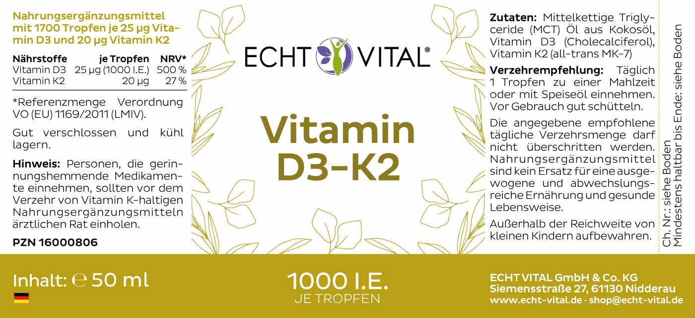 Entdecken Sie unsere hochwertigen Vitamin D3 K2 Tropfen, die in einer praktischen 50ml-Flasche verpackt sind. Diese Tropfen sind speziell entwickelt, um Ihre tägliche Nährstoffversorgung zu unterstützen und Ihre Gesundheit zu fördern.